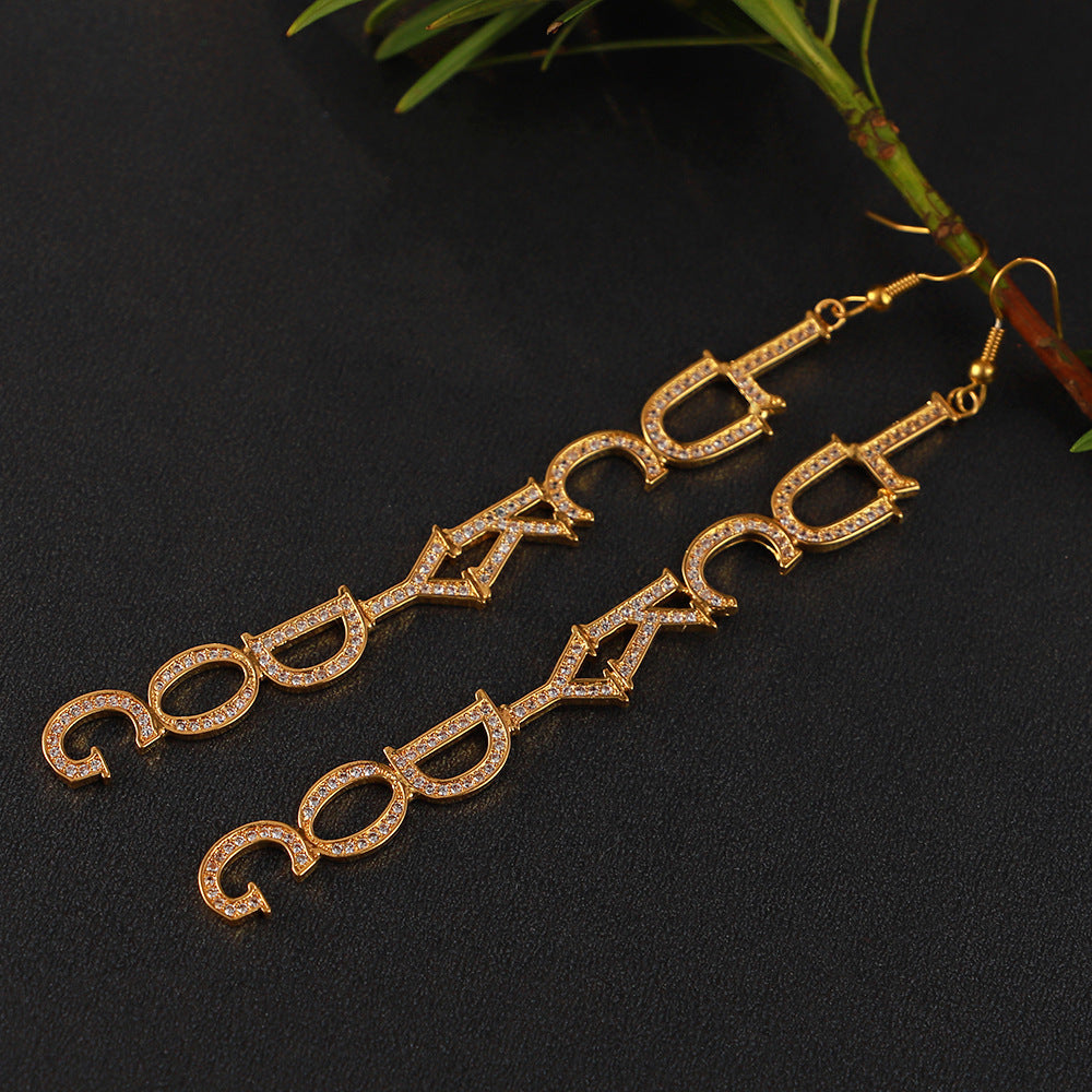 The decorative earring around the text makes the design stylish. These earrings go well with any style of clothing.