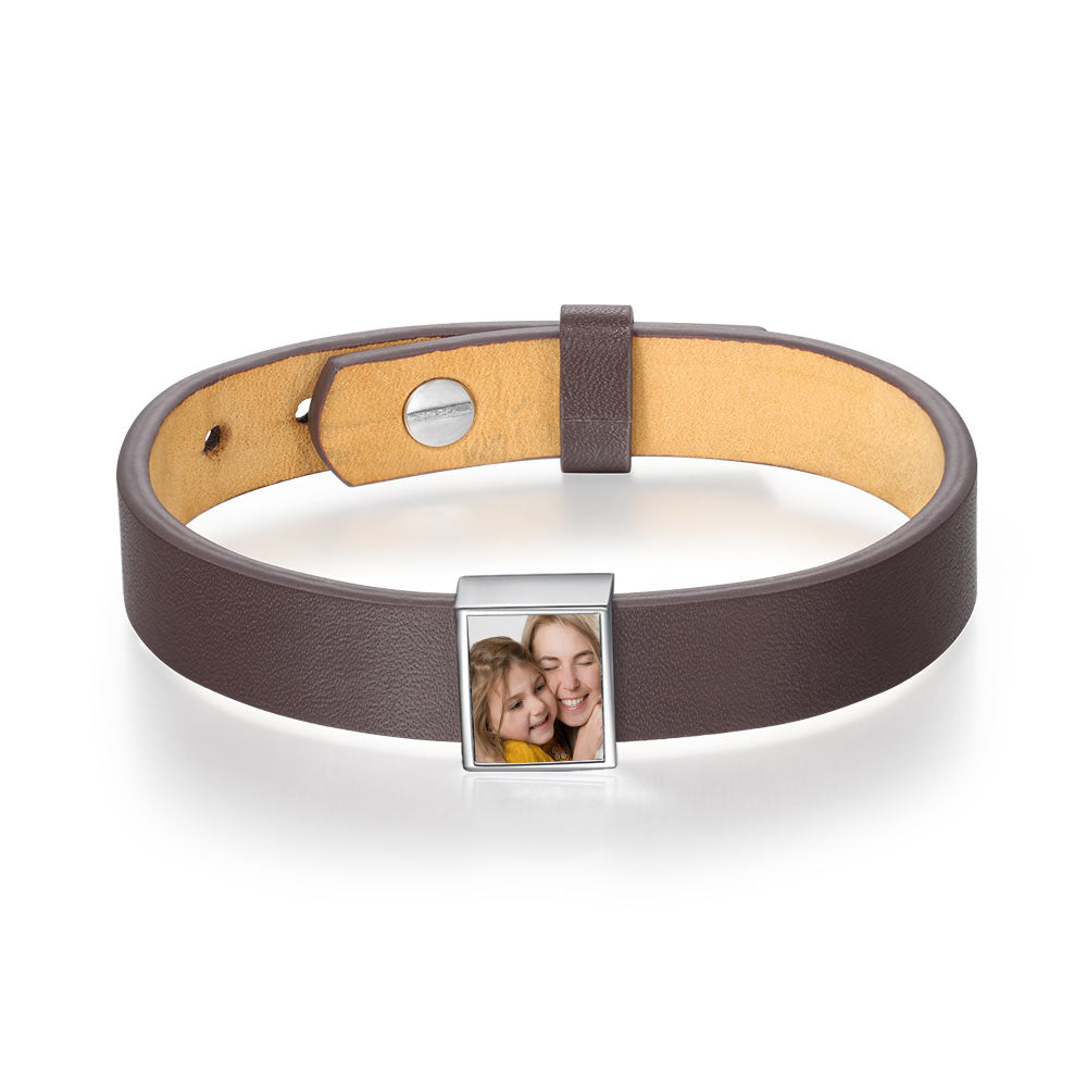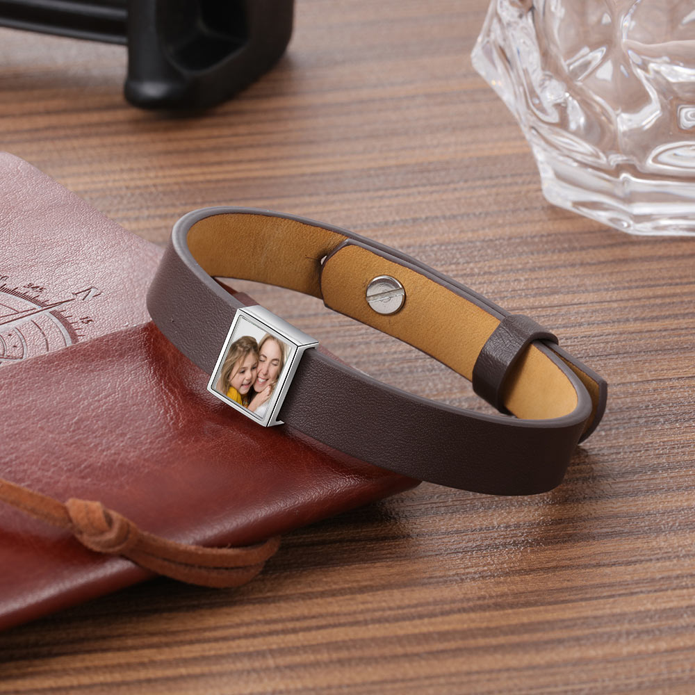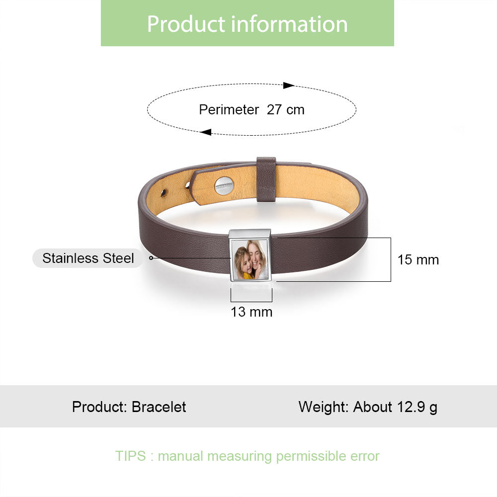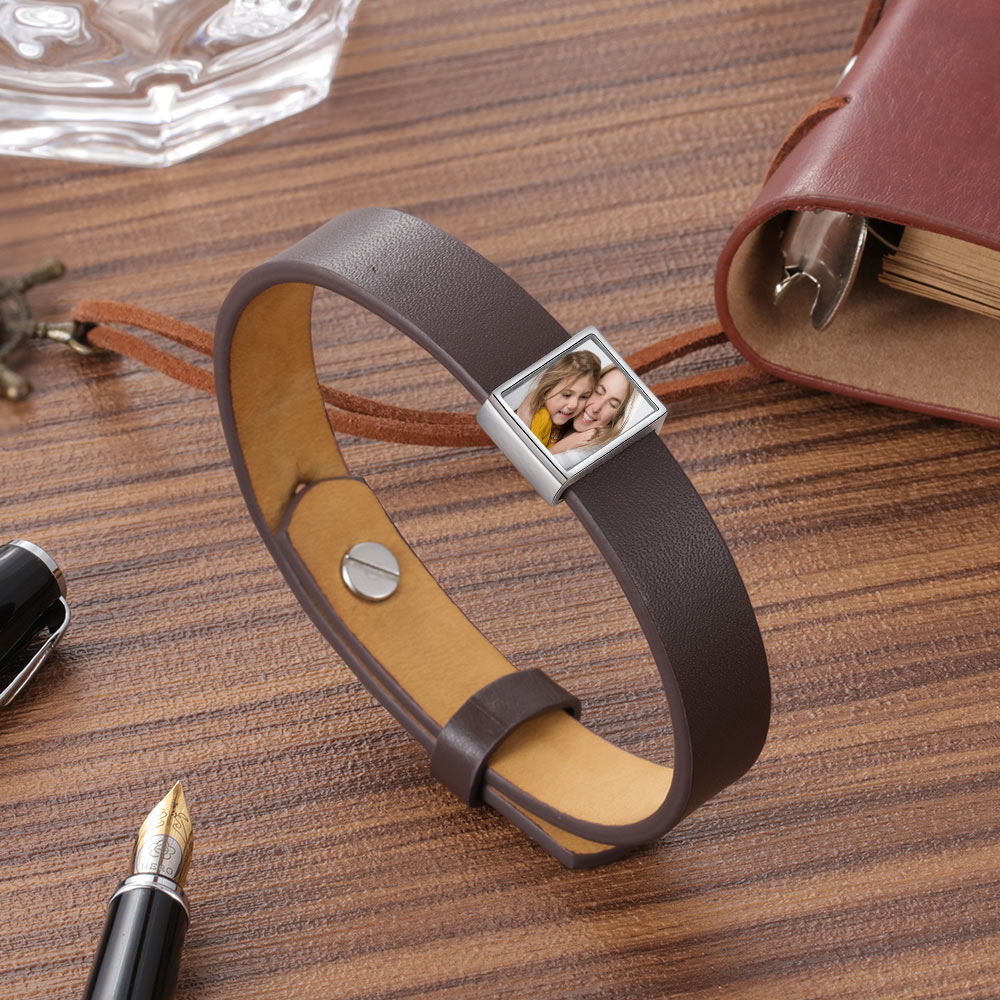 It's a fashion photo charm leather bracelet that displays your beloved photo in a stainless-stain photo frame, and the length is adjustable.