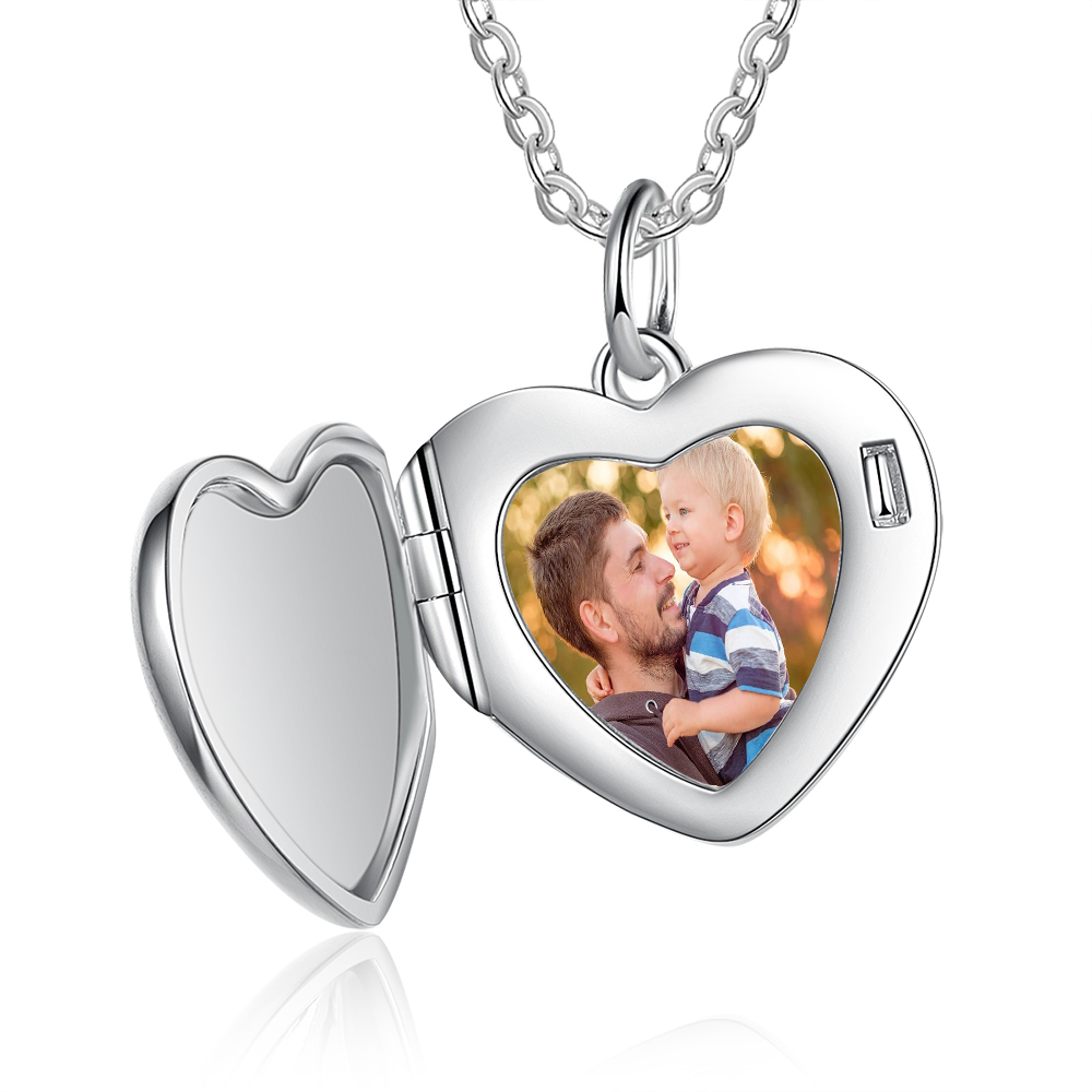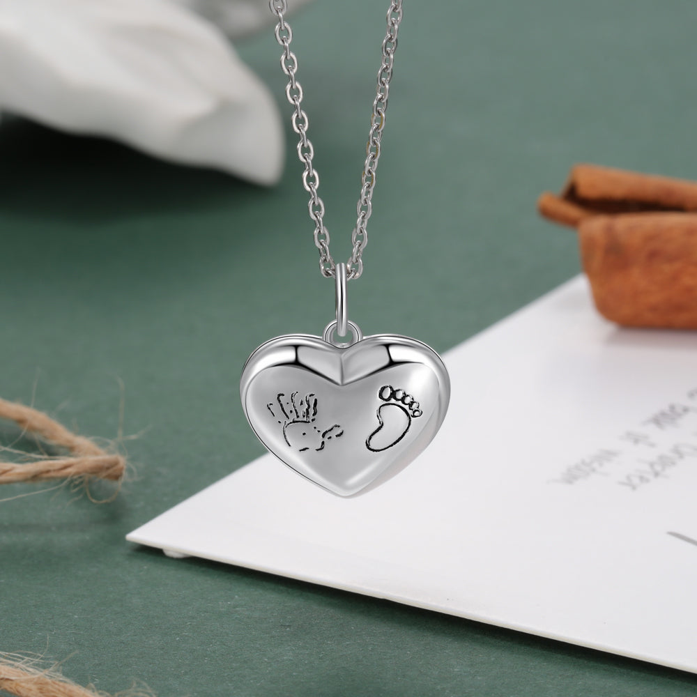 It's a cute heart photo locket necklace that displays your beloved photo in an exquisite pendant, the front is engraved with a tiny footprint while the back surface of the locket is a secret place to engrave your beloved's name.