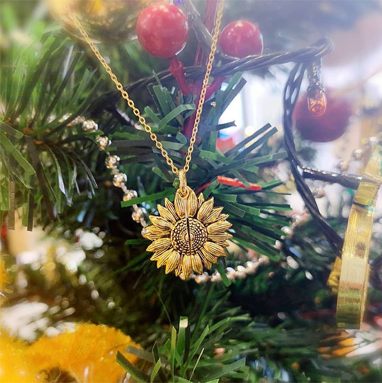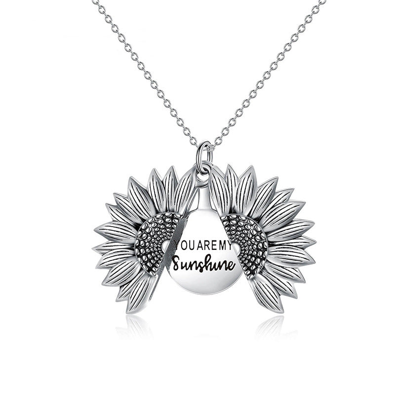 This is a sunflower-looking necklace with a sunflower shell that opens up to a custom wording. It is a simple necklace that brings you a unique and elegant impression.
